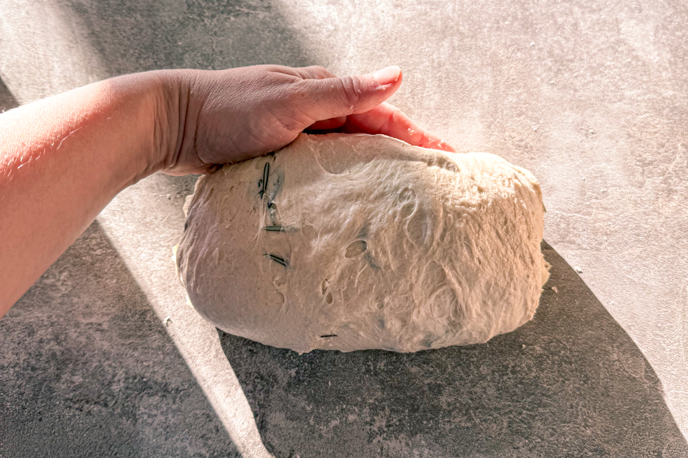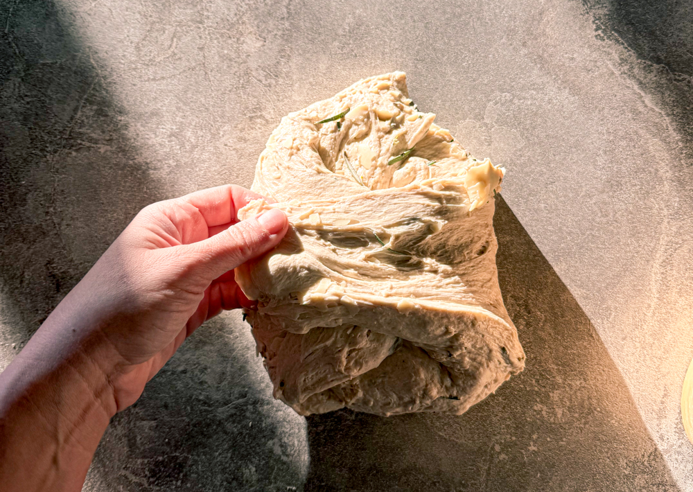 - Perform 3–4 more sets of stretch and folds spaced 20–30 minutes apart, until the dough passes the windowpane test. Each round will strengthen the dough and evenly distribute the rosemary and parmesan throughout the loaf. By the final fold, the dough should feel smoother, more elastic, and slightly puffed.