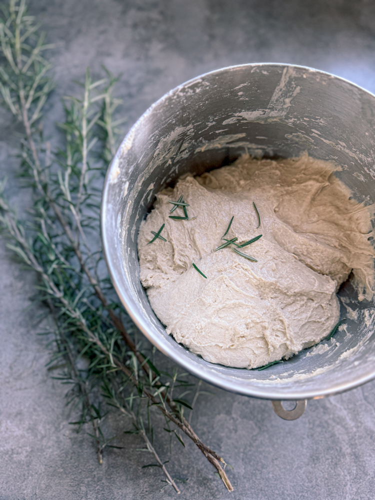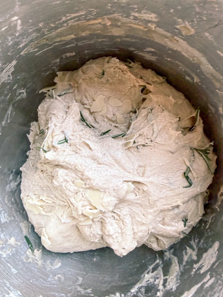- After a short rest and stretch and fold session, you’ll add chopped rosemary, and shaved parmesan.