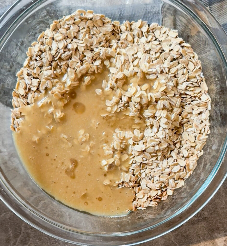 - Pour the wet ingredients into the dry ingredients and mix until fully coated and combined.