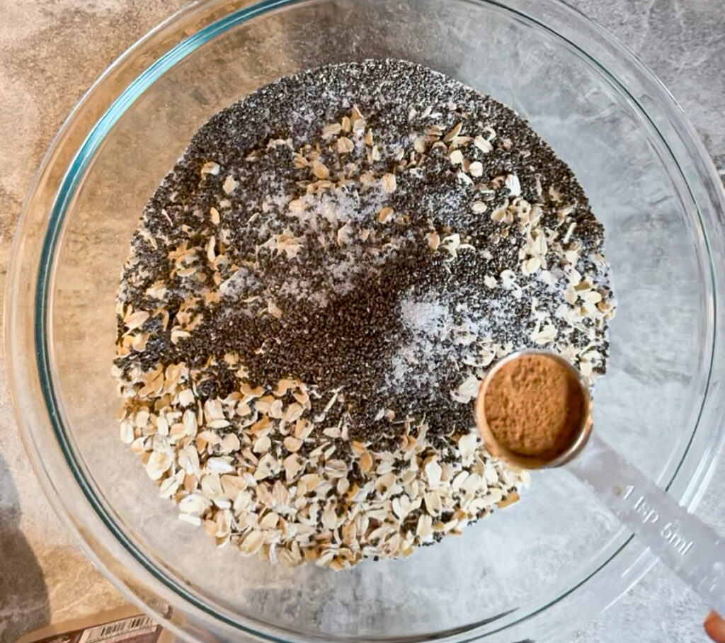 - Mix oats, chia seeds, sea salt, and cinnamon in large bowl.