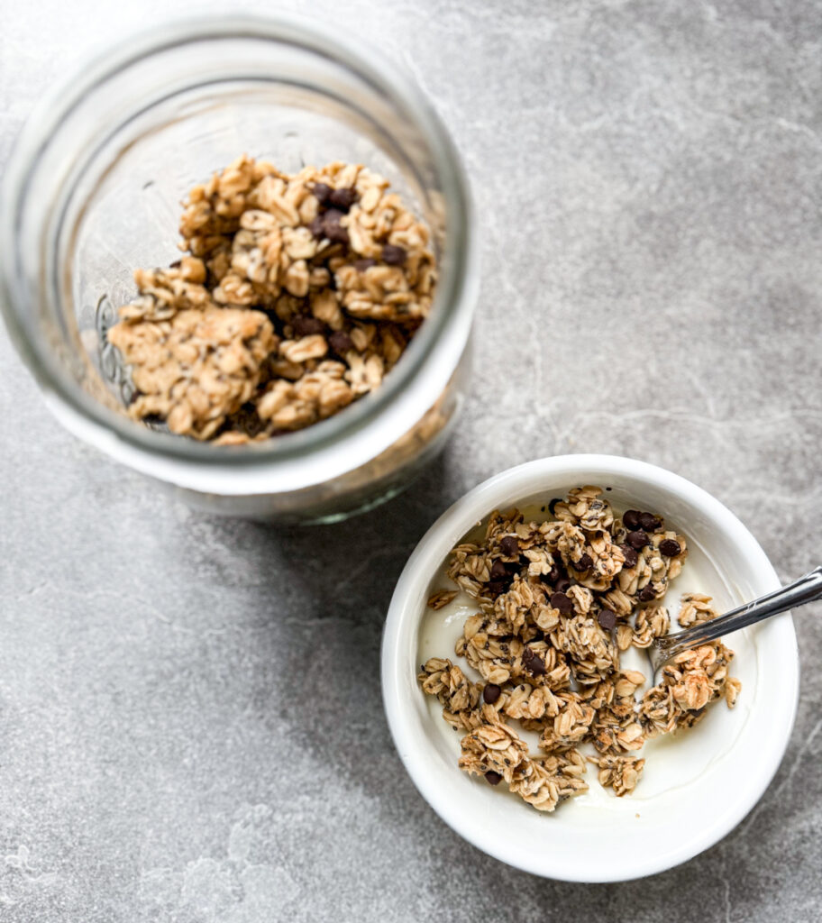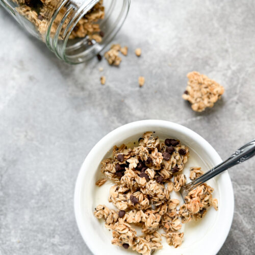 This sourdough cookie granola has all the cozy, nostalgic flavors of a freshly baked cookie—think buttery oatmeal cookie vibes with hints of vanilla, warm cinnamon, and of course, melty chocolate chips.